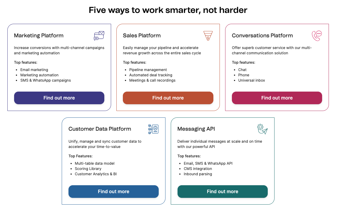Brevo는 Sendinblue라는 이름으로도 불린다. 여전히 일부 솔루션들의 Integration에서는 Sendinblue라는 이름으로 나와있고, 이메일 마케팅 뿐만 아니라, 세일즈 플랫폼이나 실시간 채팅같은 CRM, 마케팅 커뮤니케이션 영역의 상품군을 보유하고 있다.