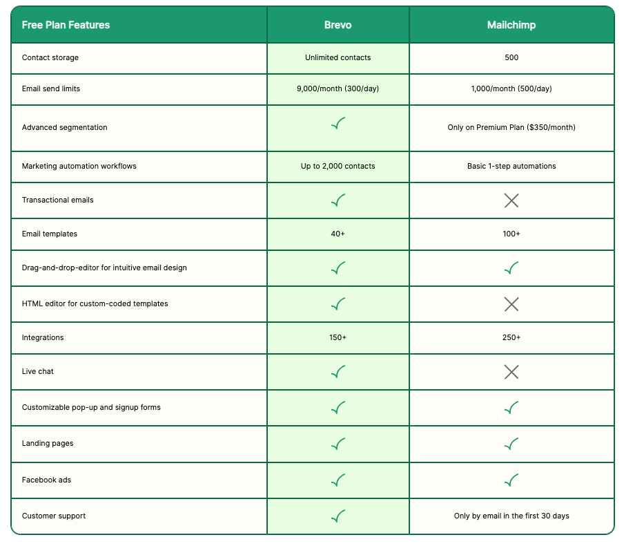 가장 큰 차이점- 메일침프는 주소록을 등록하기만해도 과금을 해야하지만, Brevo의 경우 주소록 등록은 무제한 무료, 이메일을 한달 9천개까지 무료로 보낼수 있다는 점이다. 물론 메일침프가 템플릿도 2배이상 많고, Integration을 지원하는 솔루션도 2배 가까이 많긴하지만, 이미 Brevo가 150개 이상의 Integration을 지원하고 있으니, 왠만한 대중적인 솔루션과의 연동은 어려움이 없다.