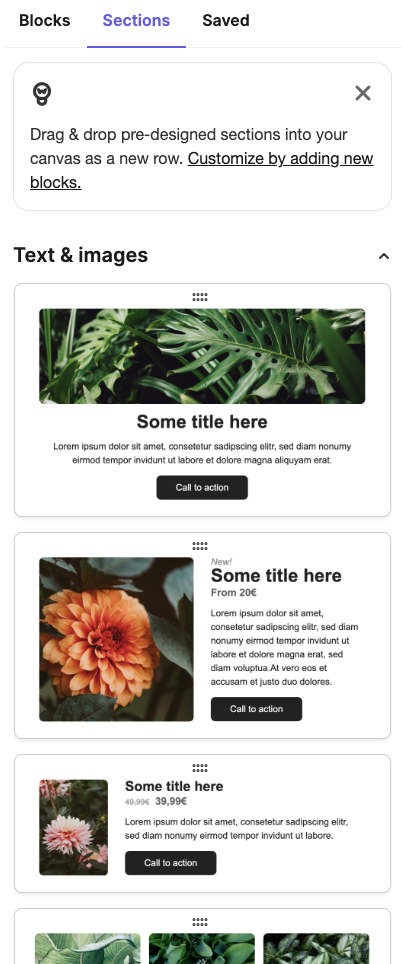 메일침프나 스티비에서 지원되는 템플릿 유형과 큰 차이가 없고, 좌측 컨텐츠 영역에서 블록이나 섹션을 선택하면 꽤 자유롭게 커스텀으로 디자인 할 수 있다. 무료인데 이 정도의 기능이 지원되는게 좋다.