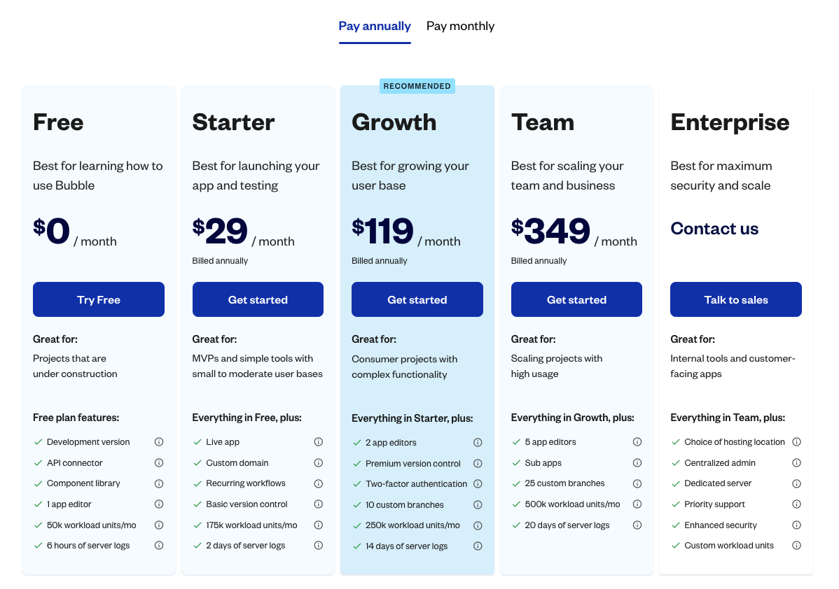 Bubble.io는 무료로 사용할 수 있지만, 무료 버전은 사용할 수 있는 Workload가 제한적이고 무엇보다 커스텀 도메인이 적용되지 않는다. 가장 저렴한 플랜은 월 36,000원 정도로 아임웹으로 쇼핑몰을 구축할때와 비슷한 요금이다. 플랜 비교는 아래를 참고. 가격 정보 자세히 보기