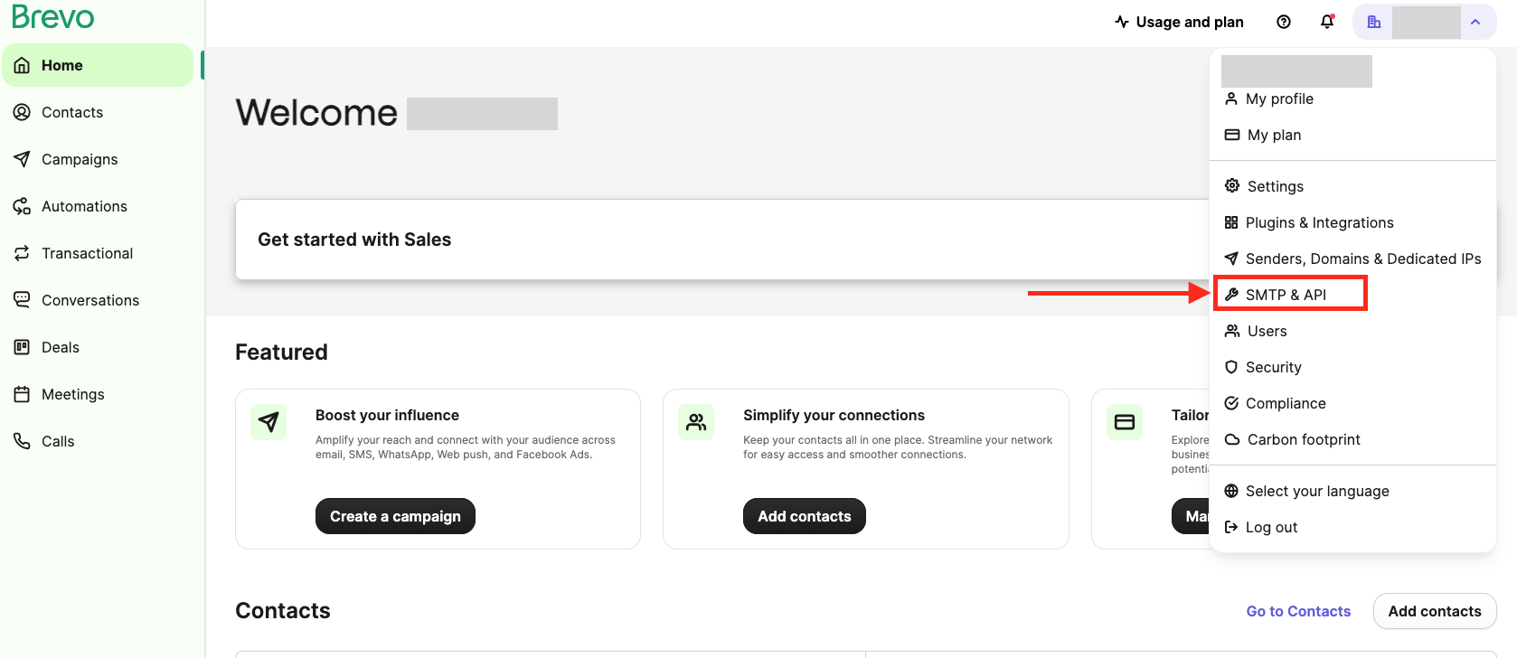 Brevo에서 템플릿으로 이메일을 작성해뒀다면 이제 API 세팅을 하면된다. 헤더의 오른쪽에 있는 계정 이름 옆의 드롭다운을 눌러 메뉴를 열고 SMTP & API를 누른다.
