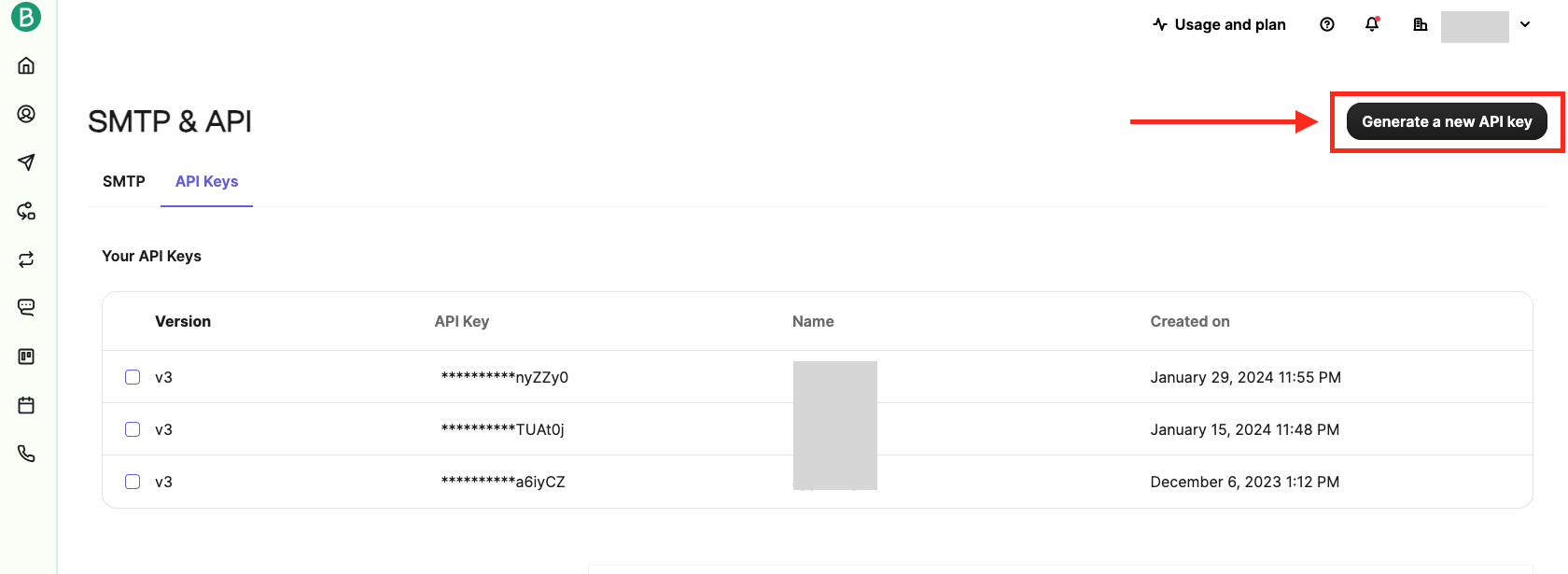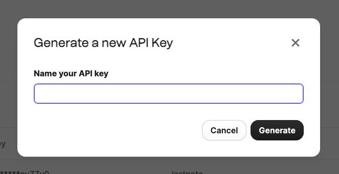 Generate a new API key를 눌러서 이름을 입력하고 Generate를 누르면 API가 만들어진다. 만들어진 API키값은 이 화면에서만 보여지기 때문에 반드시 복사해서 다른곳에 따로 저장해둔다.