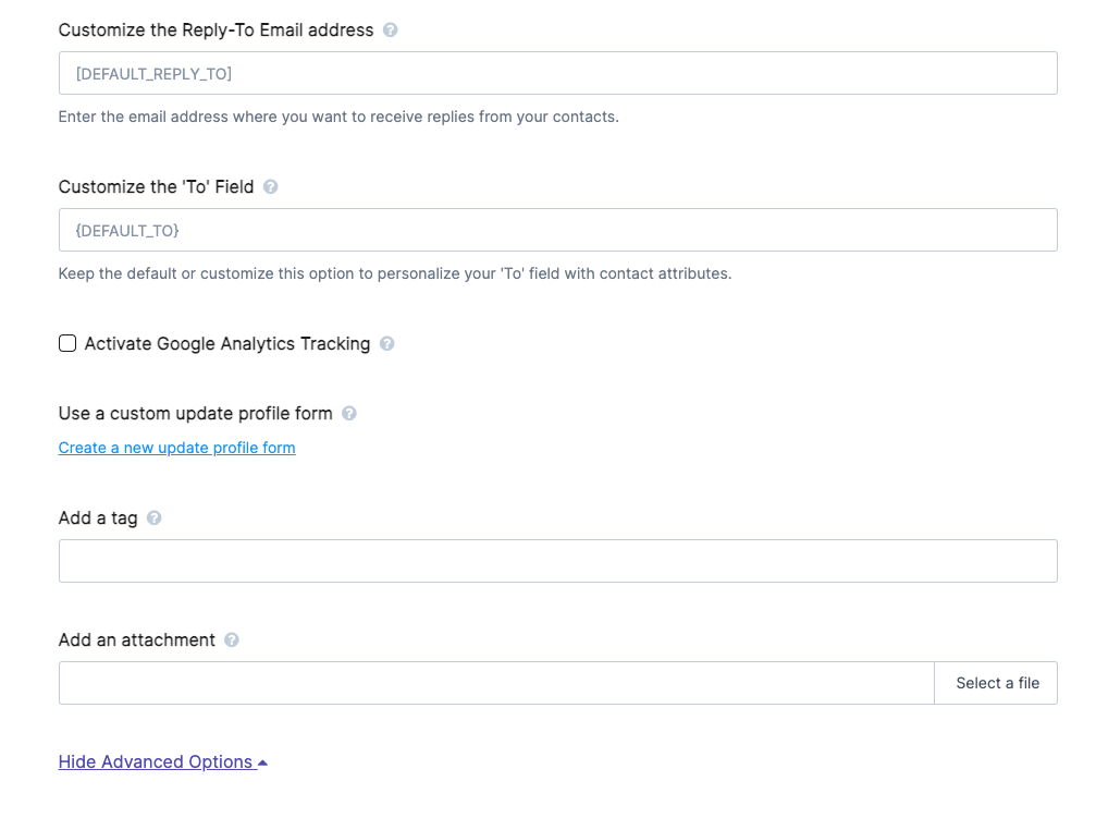 Advanced Option을 선택하면, 답장받을 이메일 주소나 태그나 첨부 파일 등을 추가할 수 있다.
