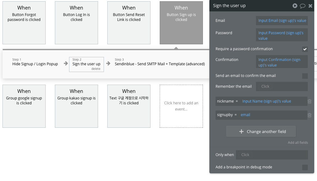 위의 설정을 마쳤다면, Workflow로 이동해서 Step1은 Account > Sign the user up으로 설정한다. Email 및 Password 값은 각각 입력 요소 값의 입력 값으로 설정된다. 추가로 "Name" 값도 사용자 이름 입력 입력 값으로 설정한다.