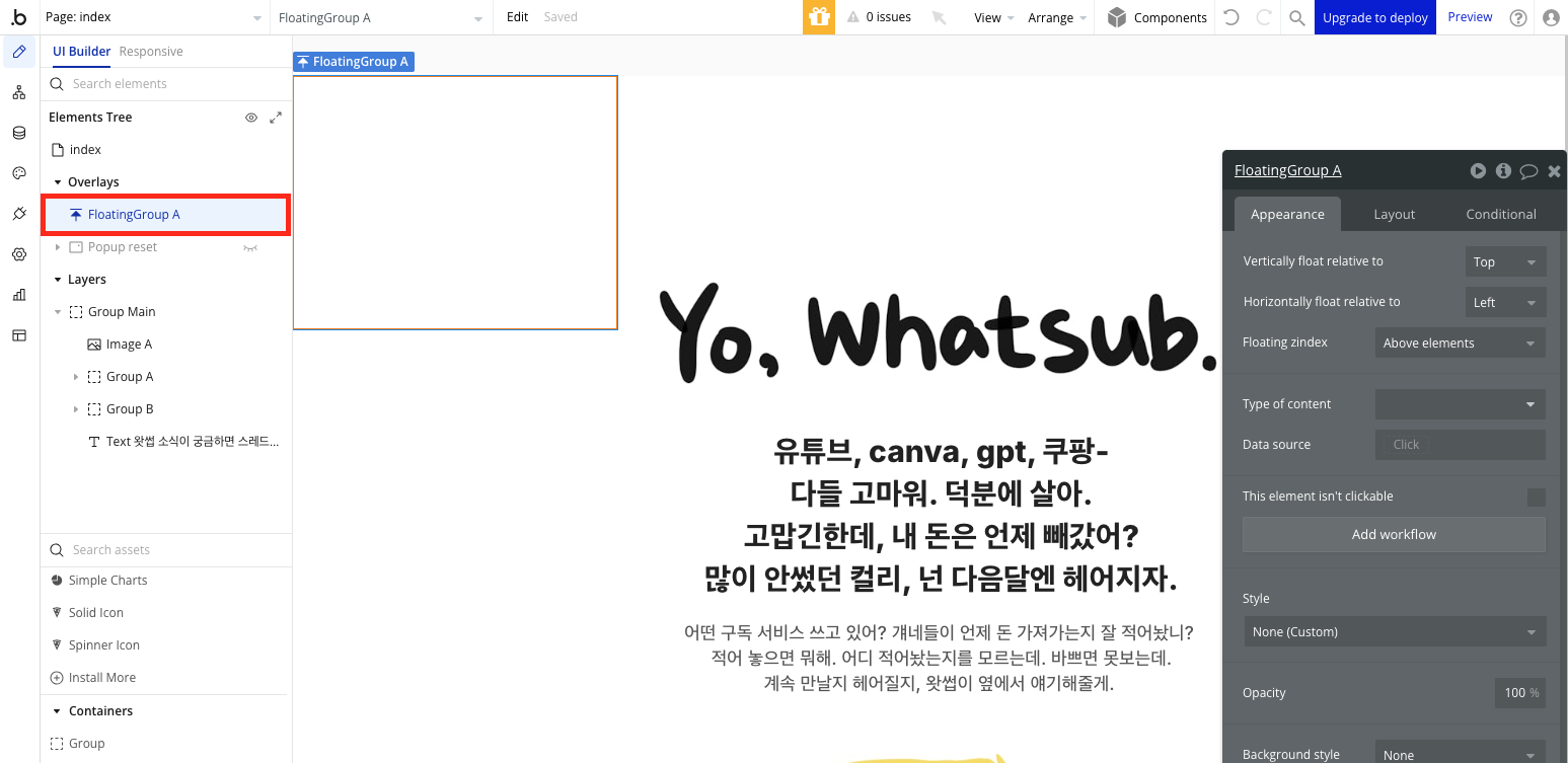 버블 디자인 탭에서 컨테이너에 있는 플로팅 그룹을 선택해서 위쪽의 Element Tree라고 된곳으로 끌어온다. 레이어쪽에 끌어와도 자동으로 오버레이 영역에 들어가게 된다.