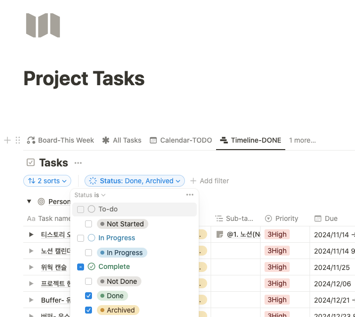 다만, 간단한 트릭으로 노션에서 태스크를 완료하면, 완료된 태스크의 컬러가 바뀌거나 없애도록 할수 있는데 궁금해하는 분들이 많아서 나의 방법을 소개해본다. 노션에 해당 기능을 직접 문의해봤는데, 없다고 해서 약간의 꼼수(?)를 써서 사용중인데, 아래의 과정으로 진행하면 된다.