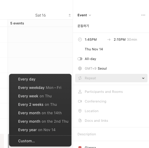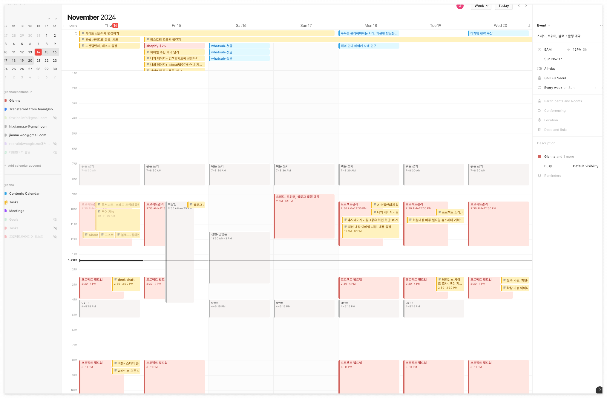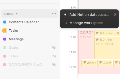 이제 노션 캘린더에서 바로 태스크를 설정하거나, 노션 데이터 베이스에서 태스크를 설정하면 캘린더 하나의 화면에서 모든 태스크가 나타난다. 노션은 태스크를 설정할때 '일정 반복'을 설정할 수없는데 만약 특정 업무나 개인 일정을 특정 요일에 반복해야한다면 구글 캘린더의 반복 기능으로 설정하면 된다.