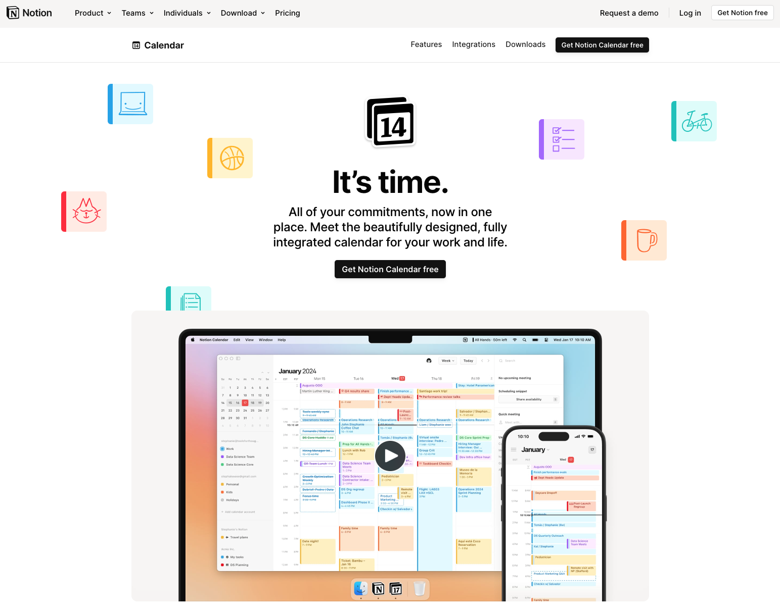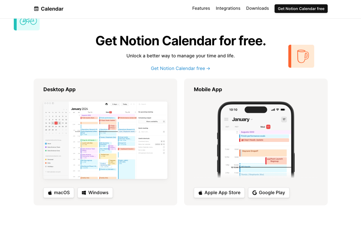 노션은 특유의 심플함과 명료한 디자인으로 많은 사람들의 사랑을 받아왔는데, 노션 캘린더 역시 기존 노션 디자인과 같이 깔끔하다. 노션 캘린더를 설치하기 위해 서비스 페이지에 접속했을때도 핵심 문구와 서비스 모습만 간단하게 있기때문에 처음 서비스를 써보는 사람들에게도 '새 것'을 익혀야하는 심리적 부담감이 덜하다.