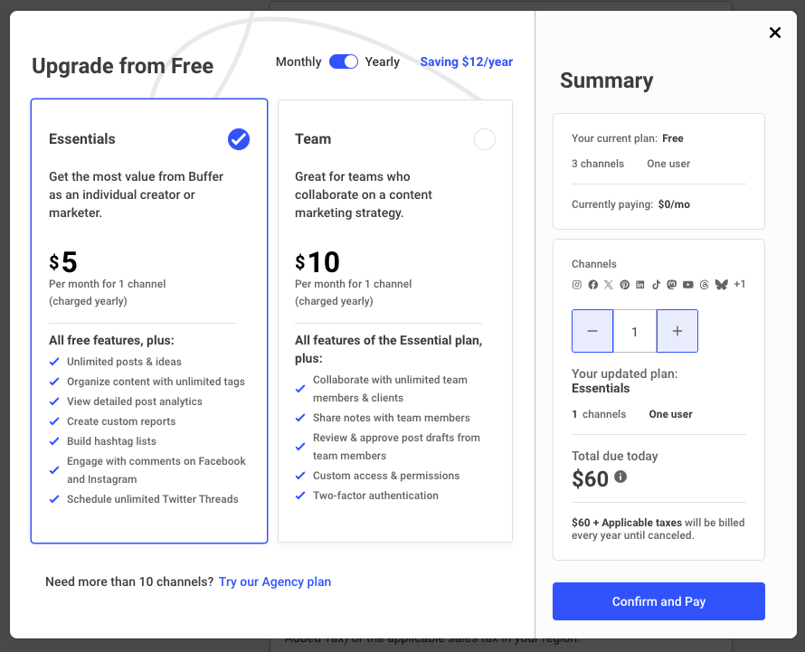 포스팅을 한달에 5개 이상 예약한다면 연간 결제 기준으로 채널 하나당 5달러에 시작할 수 있다.