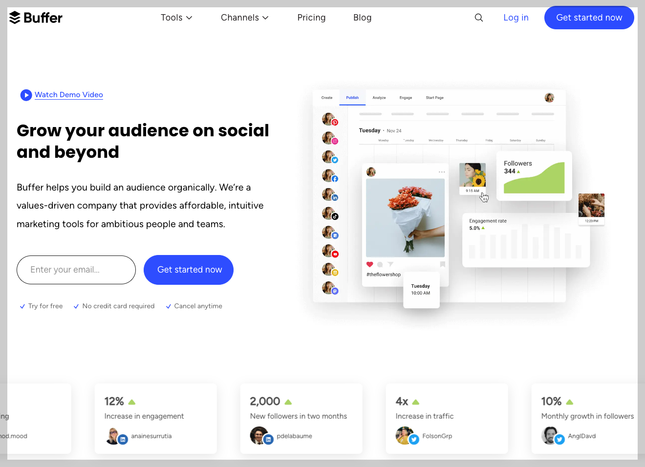 Buffer는 소셜 미디어 관리를 위한 플랫폼으로, 개인 또는 기업이 다양한 소셜 미디어 계정을 한 곳에서 관리할 수 있도록 도와주는 도구다. Buffer를 통해 콘텐츠를 미리 작성해두고, 발행 날짜와 시간을 예약, 게시물 별 성과를 분석할 수 있다.