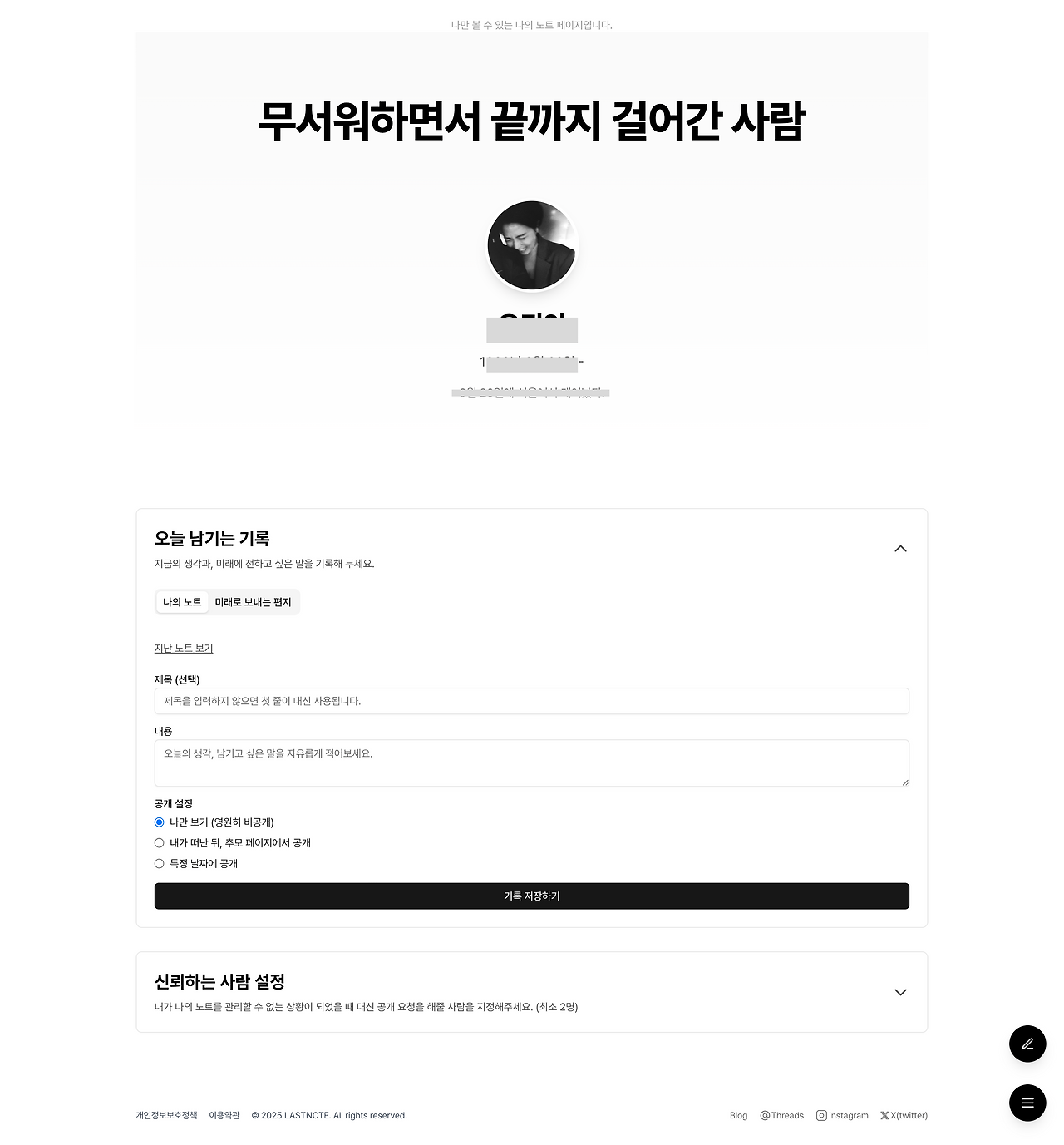 라스트노트는 나의 묘비에 남길 글을 미리 적어보는 삶에 대한 회고의 기록이자 떠나간 사람들을 위한 기억의 공간입니다.