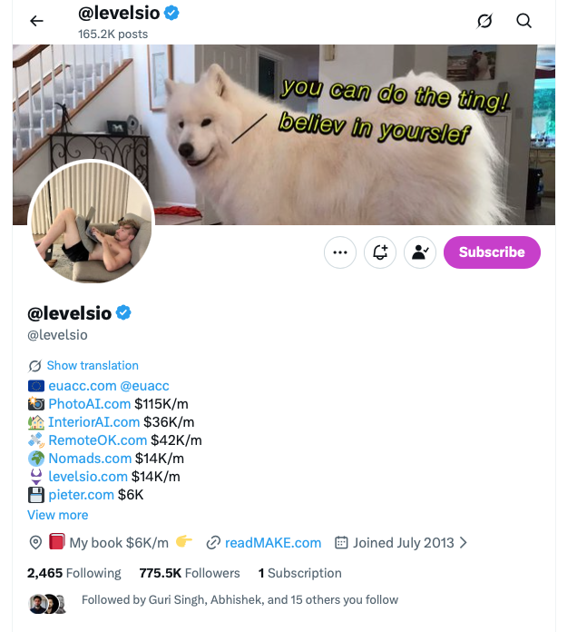 피터 레벨스는 자신의 모든 개발 과정, 수익, 실패 경험을 트위터에서 투명하게 공유해 왔다. 이 전략 덕분에 그는 현재 77만 명(25년 12월 기준)의 팔로워를 보유하고 있으며, 이것이 그의 가장 강력한 마케팅 채널이 되었다.